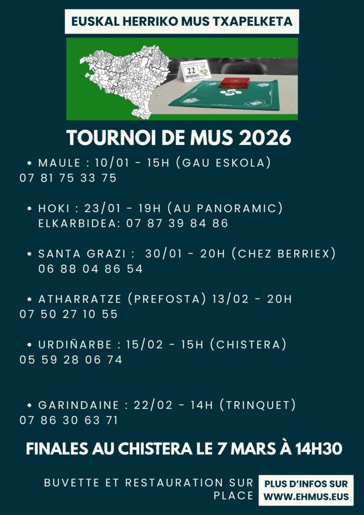 Elkarbidea alkarteak Euskal Herriko Mus Txapelketa antolatzen dü urtarrilaren 23an, ostiralearekin, 7tarik aitzina, Le Panoramic ostatüan, Hokin. Jateko eta edateko lekü berean. Izen emaitea : 07 87 39 84 86 (10€ jokülarikal)