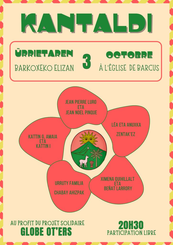 Le vendredi 3 octobre à 20h30, un kantaldi aura lieu à l’église de Barcus au profit du projet solidaire Globe Ot’ers porté par une jeune barcusienne !! Un programme copieux et un rendez-vous à ne pas manquer !!