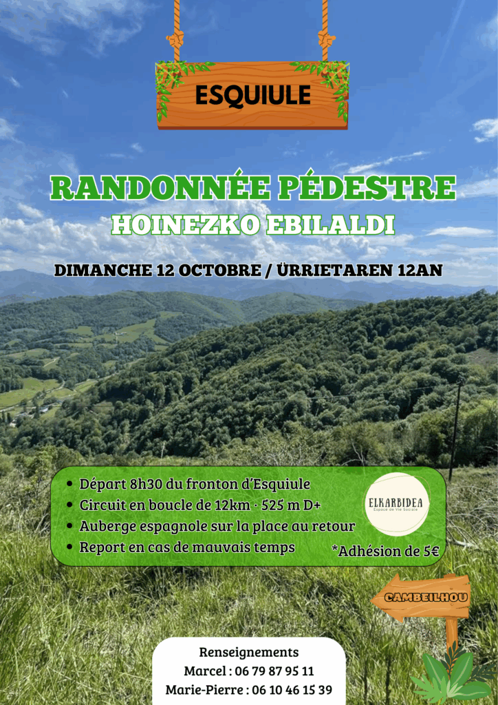 Suite au mauvais temps, la rando est reportée au 12 octobre !! L’Espace de Vie Sociale Elkarbidea organise une randonnée pédestre le dimanche 21 septembre sur Esquiule !Le départ est fixé à 8h30 depuis le fronton du village. Une boucle de 12km est au programme. Prévoir à manger et boire pour l’auberge espagnole au retour