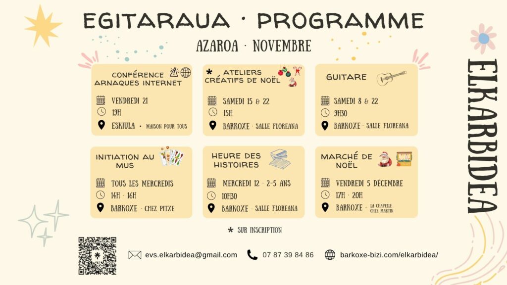 Inscrivez-vous à la newsletter en envoyant un mail à evs.elkarbidea@gmail.com ou bien en scannant le QR code ci-dessous « Inscriptions Berriak – Elkarbidea »